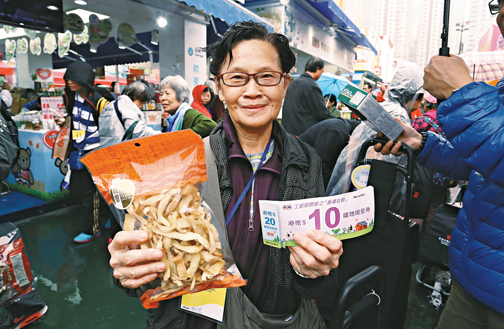 参与活动的75岁的陈婆婆表示,虽然自己每年都会前来工展会,但受家中经济环境所限,“几乎都系斋睇唔买”,甚少购买商品。她又称,主办方提供现金券能让她买到心仪已久的海味产品,并开心说,“打算过年带去小儿子家一起食用。”