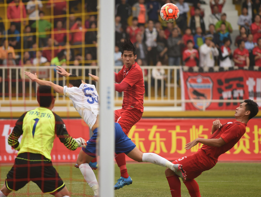 图:港足中坚张志勇(右二)头槌建功\大公报记者李恆基摄