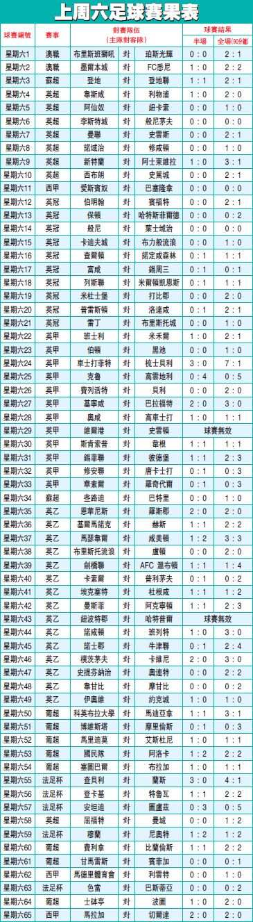 上周六足球赛果表