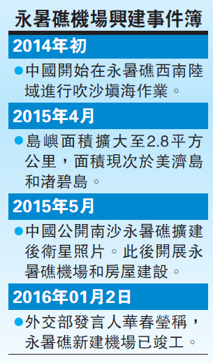 去年6月,新华社发布一张永暑礁完成吹填工程后的卫星图片显示,完成吹填工程的永暑礁形状像一艘航空母舰,明显能看到有军港和长长的飞机跑道。英国权威防务杂誌《简氏防务周刊》网站曾报道,中国完成了永暑礁上的机场跑道建设,并进一步接近将跑道投入使用。