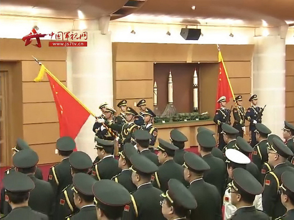 【大公报讯】2015年12月31日,中国陆军、火箭军、战略支援部队成立大会在八一大楼举行。在授予军旗过程中,大会现场摆放的几款导弹模型引人注意,从右向左分别是东风5A、东风31A、东风21A/C,打击远中近三层战略目标。