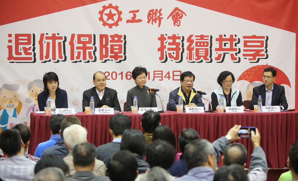 图:林郑月娥(左三)昨出席由工联会举办的退休保障谘询会\大公报记者麦润田摄