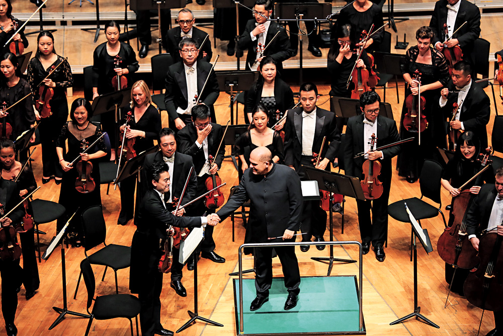 图:“港乐”全体成员于“贝三与贝八”演出后向观众致谢,指挥与乐手相互握手互致合作成功\Cheung Chi Wai摄