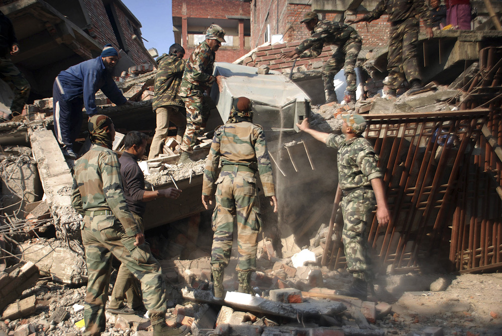 图:印度军人试图从坍塌的瓦砾中找到幸存者\美联社