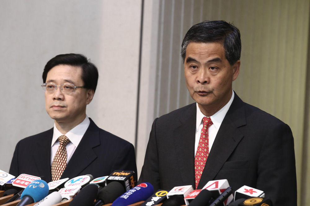 图:行政长官梁振英(右)昨日联同署理保安局局长李家超会见传媒,表达特区政府对李波失踪事件高度关注\大公报记者何嘉骏摄