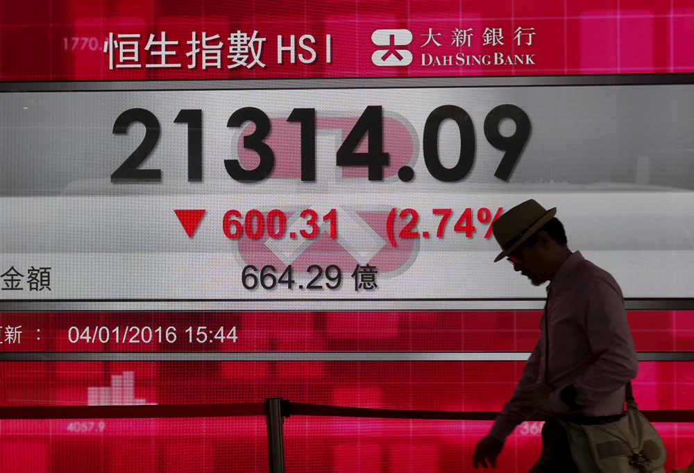图:二○一六年港股首个交易日,开了个“满场黑”。恒指由头跌到尾而无反弹。最低时,恒指报二一二二七,跌六八七点。上图所见,恒指于下午三时四十四分下跌点数是六○○点\路透社