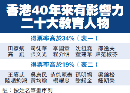 得票率高于19%的十位人士是,前港大校长王赓武、教联会创会会长吴康民、前教统会主席范徐丽泰、前教育局局长孙明扬、前教统会主席梁锦松、幼儿教育家陆赵钧鸿、教联会会长黄均瑜、前教联会会长杨耀忠、港大教育学院教授谢锡金和已故树仁大学校长钟期荣。
