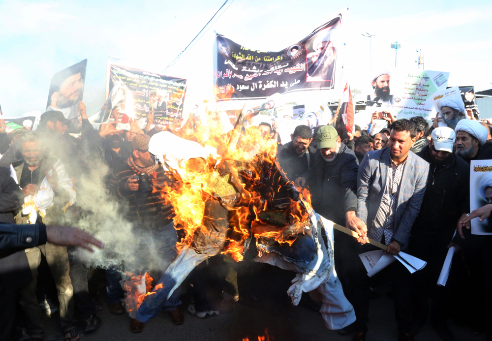 图:巴格达什叶派4日烧毁沙特国王萨勒曼的人偶\美联社