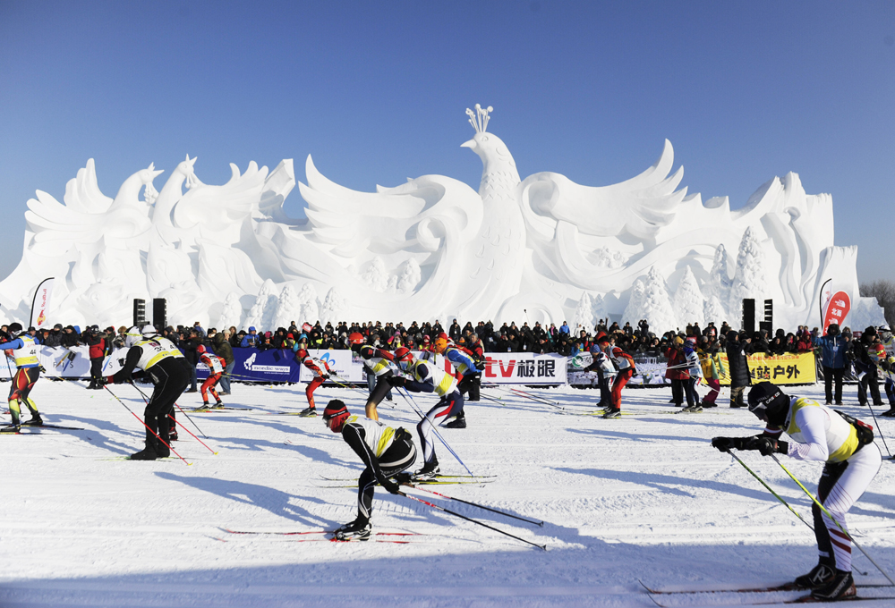 图:4日,来自俄罗斯、中国等33个国家的滑雪运动员和爱好者齐聚长春,参加净月潭瓦萨国际滑雪节\中新社