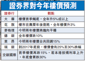 香港去年楼价创新高后回软,2016年住宅楼价进一步受压,已差不多是市场共识,但大摩却大唱反调。大摩预期楼价有望在首季触底,全年价格升幅至少有5%,而支持楼价反弹的因素主要因求过于供情况持续,每年首次结婚人数在过去5年增加18%,而美息上调的冲击力有限,且政策风险回报仍然吸引。另外,早前预期今年楼价升3%的花旗则表示楼价走势会为投资者带来惊喜。\大公报记者 刘?豪