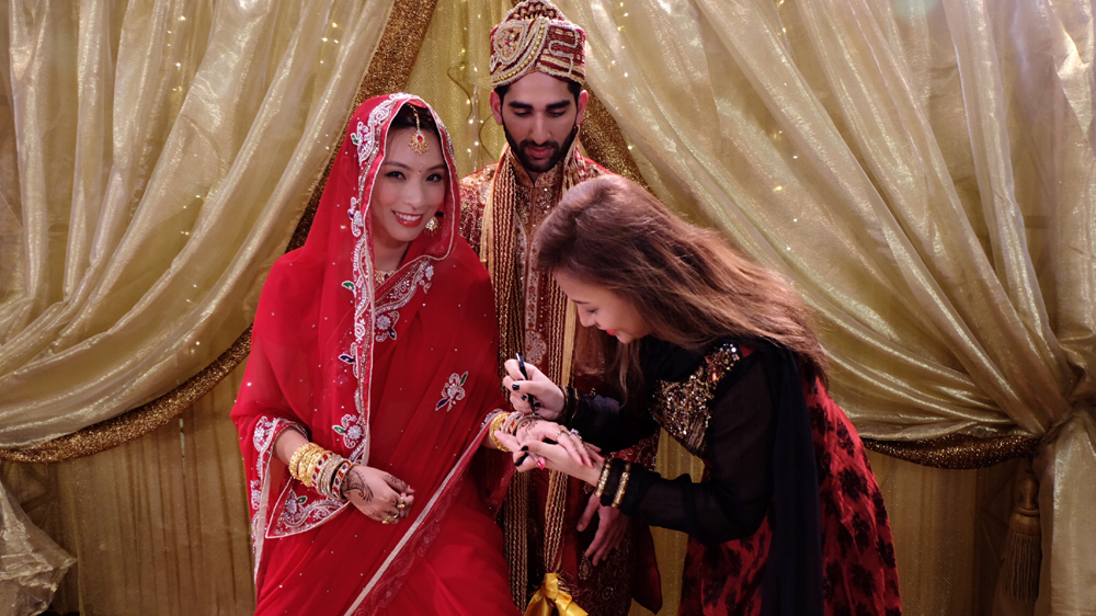 图:朱慧敏(左)在手上绘纹身扮印度新娘