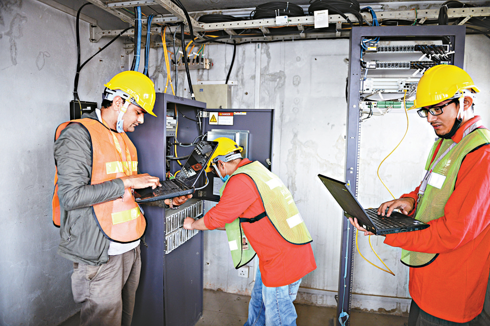 图:去年五月,尼泊尔大地震后,华为工程师在巴德岗古城站点检查设备\资料图片