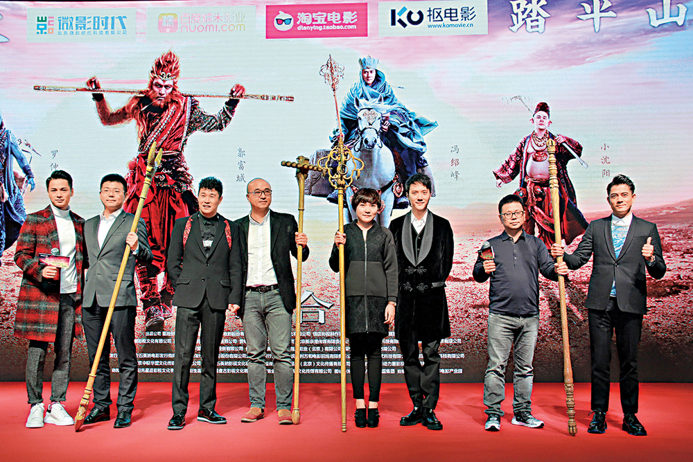 【大公报讯】3D魔幻动作喜剧《西游记之孙悟空三打白骨精》昨在上海举行发布会,“西行四圣”郭富城(城城)、冯绍峰、小渖阳、罗仲谦等出席。城城现场还原美猴王的灵活英姿,唐僧冯绍峰用上海话幽默点评三个徒弟。IMAX同时宣布将在猴年春节档重点力推《西游记之孙悟空三打白骨精》,冀助该片取得春节档票房冠军。席间,四位演员将四大法器分别转交给电影联合出品方中的四大电商,寓意四大票务电商为该片保驾护航,提供助力。