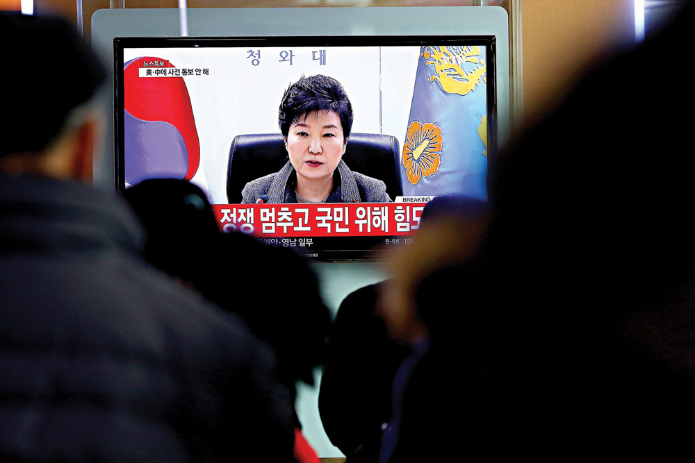 图:首尔民众6日观看韩国总统朴槿惠就朝鲜核试发表讲话/彭博社