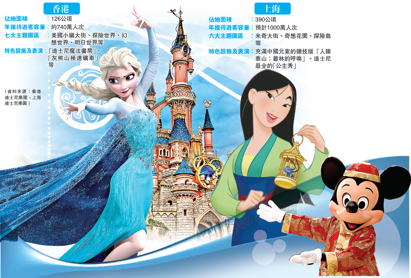 香港迪园有七大主题园区,包括美国小镇大街、探险世界、幻想世界、明日世界、迷离庄园、野矿山谷和反斗奇兵歷险地带。上海迪园则包括六大主题园区:米奇大街、奇想花园、探险岛、明日世界、宝藏湾及拥有奇幻童话城堡的梦幻世界。