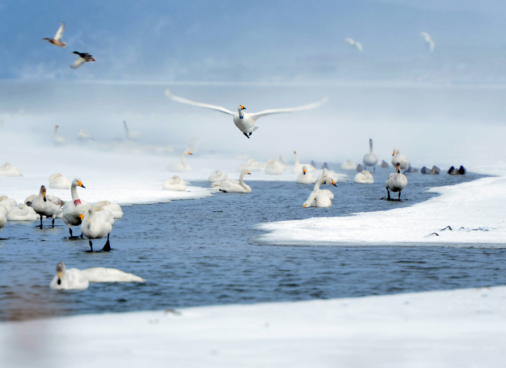 1月18日,山东省荣成市天鹅湖,白天鹅在雪中翩翩起舞,给冬日的海滨城市增添了一道别样风景。/新华社