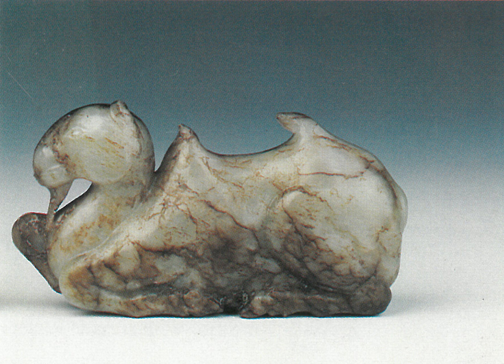 从新石器时代各地原始文化,直至春秋战国时期,均未见发现有玉琢骆驼出土。汉代才出现立体玉雕双峰骆驼(立姿,长十六点五公分)。《玉雅》载:“金史世宗纪,大定二十六年,皇孙生,章宗进玉双驼镇纸。”那时玉骆驼比玉马少很多。汉代张骞出使西域乌孙、大宛、月支、大夏等国,把丝织品和铁器等输至西域。迄宋、元两代,玉骆驼仍较少,且双峰竟夸张成尖峰形(见附图),坐姿却似狗。