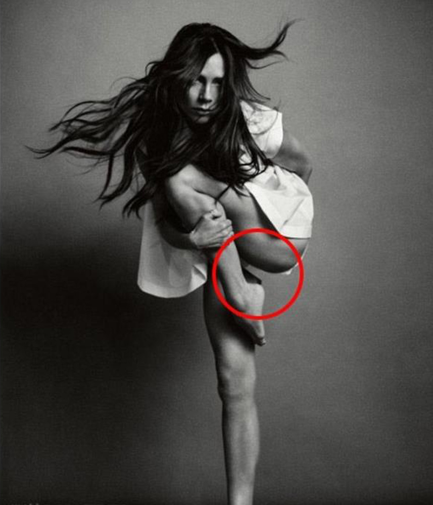 【大公报讯】据英国《每日邮报》报道:碧咸的妻子,时尚界设计新星维多利亚早前为《时尚》杂誌拍摄了一系列照片,却被眼尖粉丝发现大腿上方有块空白,批评是修片过度造成。