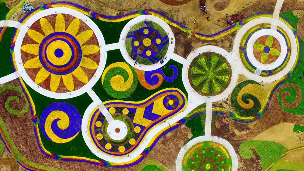 近日,江苏扬州马可波罗花世界公园内百花绽放,各式花坛和园中景观色彩交织,给人全新的视觉感受。