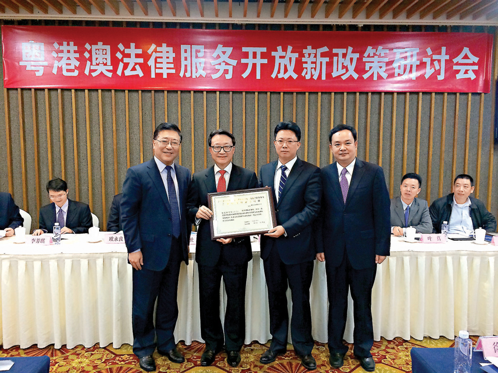 图:广东省司法厅副厅长梁震(右一)等为华商林李黎联营律师事务所颁发执业证书 大公报记者黄仰鹏摄