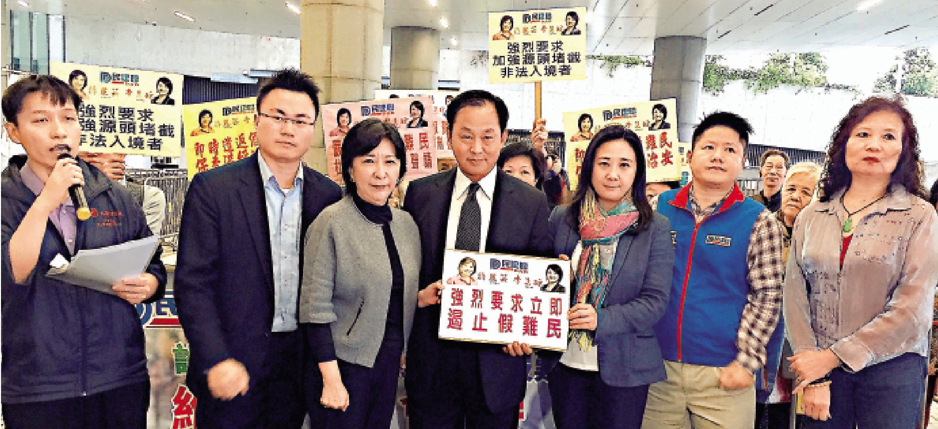 民建联九龙城支部区议员及居民一行,趁立法会讨论免遣返声请制度,到立法会外请愿要求加强堵截“假难民”,正视治安恶化及黑工问题,保安局政治助理刘富生(左四)接收请愿信。