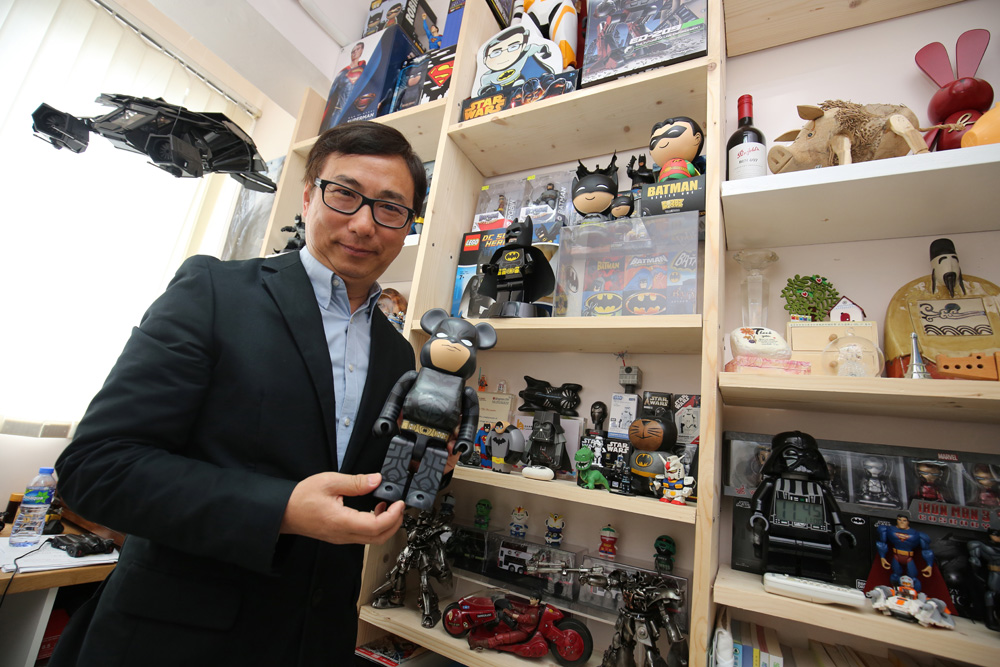 图:狄志远是“蝙蝠侠迷”,其办公室内放满蝙蝠侠模型等产品。他说,自小已喜爱这位漫画英雄大公报记者 麦润田摄