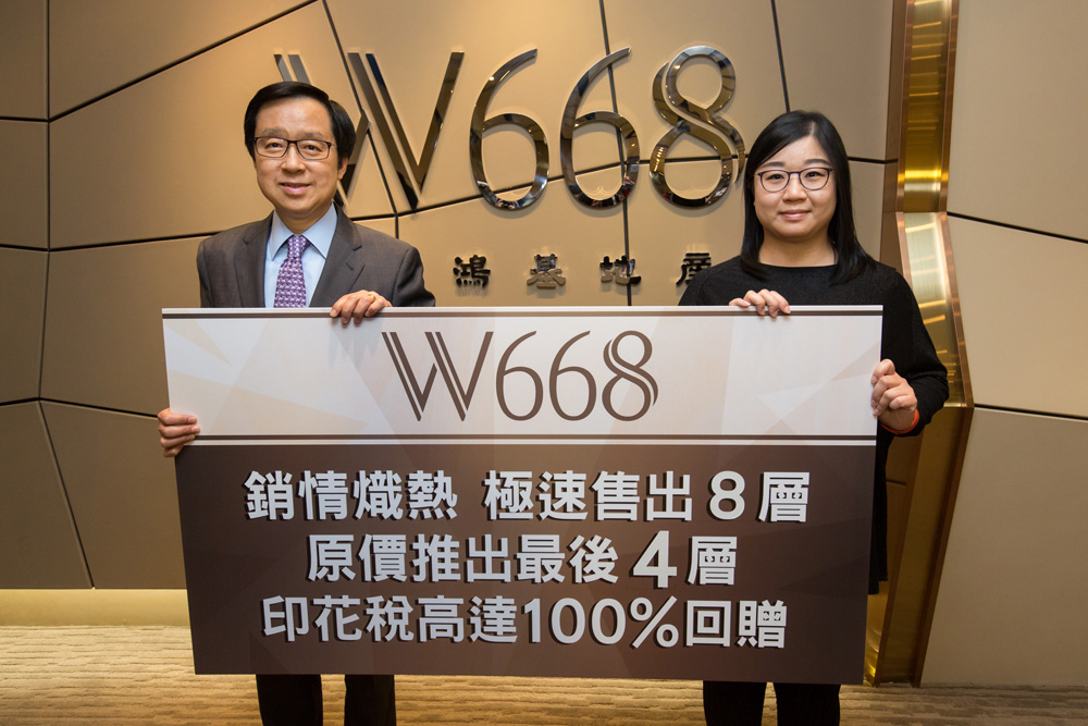 新地副董事总经理雷霆表示,集团W668上周开售,迄今已卖八层楼面,平均呎价约9000元,套现约五亿元。见反应理想,昨天加推四层楼面,而馀下最后六层楼面,考虑加价5至10%,若整个项目共18层楼面悉数售罄,料套现约12亿元。