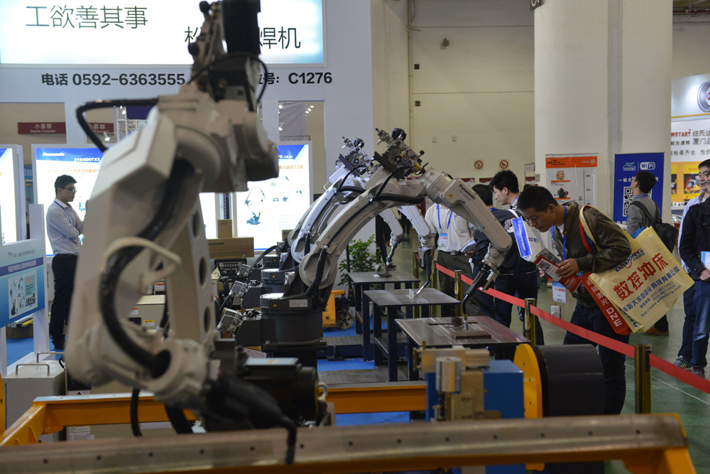 图:厦门工业博览会(工博会)暨第二十届海峡两岸机械电子商品交易会(台交会)十二日在厦门会展中心开幕。图为焊接机器人亮相厦门 中新社