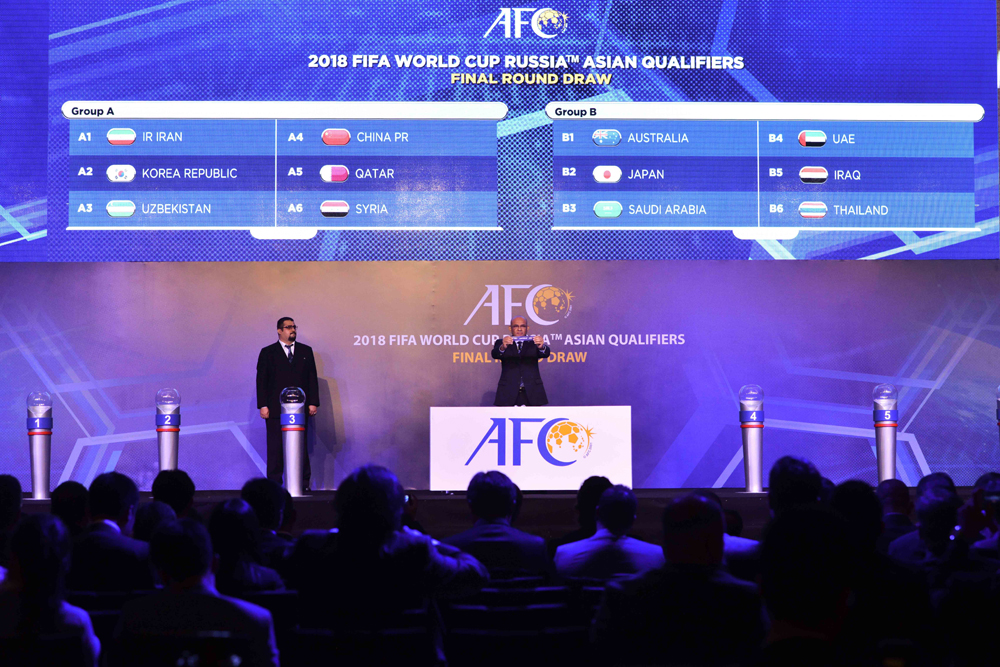 【大公报讯】综合新华社、中新社吉隆坡报道:2018年俄罗斯世界杯亚洲区外围赛最后阶段的12强赛抽籤仪式12日在马来西亚首都吉隆坡举行。中国国家足球队与伊朗、韩国、乌兹别克、卡塔尔及叙利亚同分在A组,首场比赛将是今年9月客场挑战韩国。