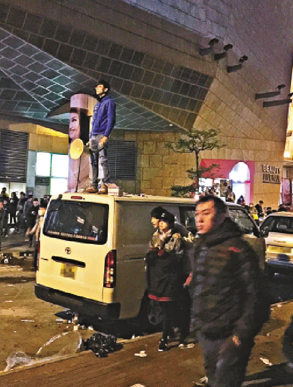 图:黄台仰(站车顶者)因参与年初一旺角暴乱被控暴动罪 资料图片