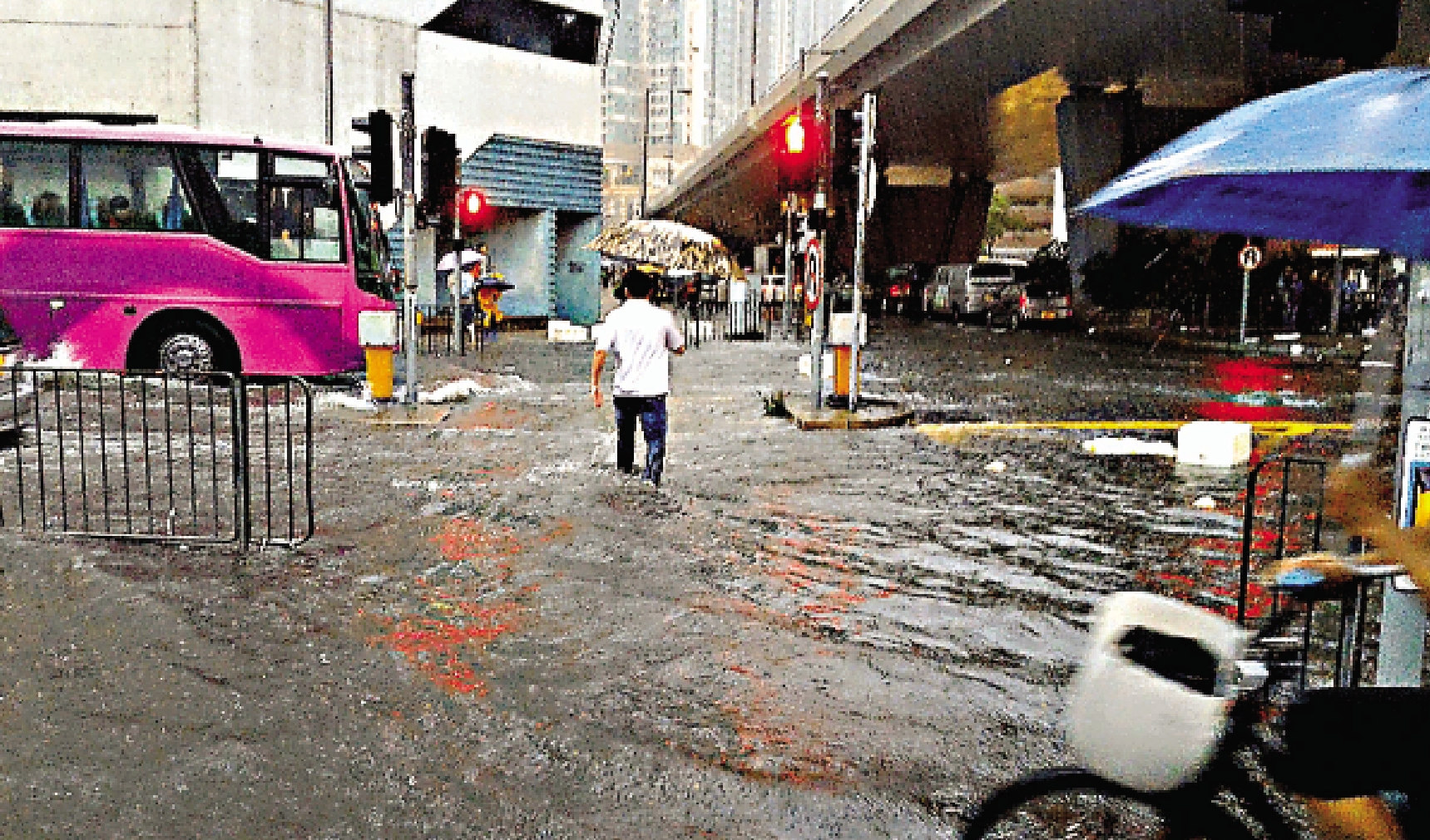 长沙湾发祥街西与英华街交界,警方昨晨八时接获有一辆校巴死火,被困近一米深水中的求助报告,大批消防员赶至涉水将近十名被困小学生抱出校巴至学校,有网民拍到消防员背负一名中学生离开水浸街道。另外,港铁东铁线上水站地下近新运路出口,树叶堵塞至排水喉倒流雨水,令假天花一度出现水帘,港铁发言人表示有关人员立即疏通后已没有出现漏水。