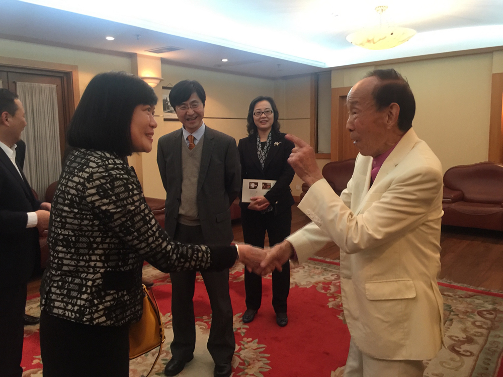 图:邓仲敏(前排左)与陆春龄(前排右)交谈称,音乐无界,是一个很好的交流平台 大公报记者 夏微摄