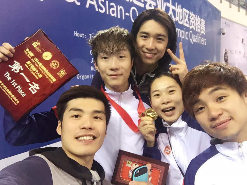 图:张家朗(左二)夺冠后与港剑击队队长张小伦(左一)、崔浩然(右三)、连宝香(右二)、杨子加(右一)合照 图片由张小伦提供