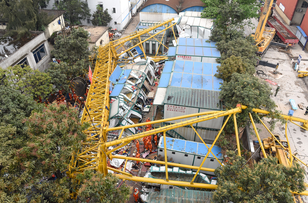 图:4月13日,由于突发雷电大风强降雨,东莞市麻涌镇工地一龙门架被大风吹倒,图为救援人员在坍塌现场进行救援 新华社