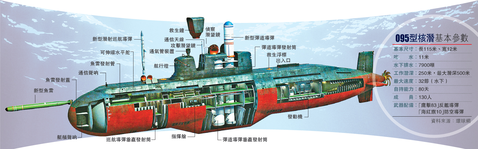 【大公报讯】综合人民网、新浪网、简氏防务周刊报道:《人民海军》近日刊登了一张中国海军从未露面的潜艇照片,外界从外形猜测,这是安装了垂直发射系统的093B型攻击核潜艇,可以装备“鹰击18”超音速远程反舰导弹和“长剑10”对地巡航导弹的潜射型号。中国军事专家认为,该型核潜的性能高于美军现役“洛杉矶”级攻击核潜。