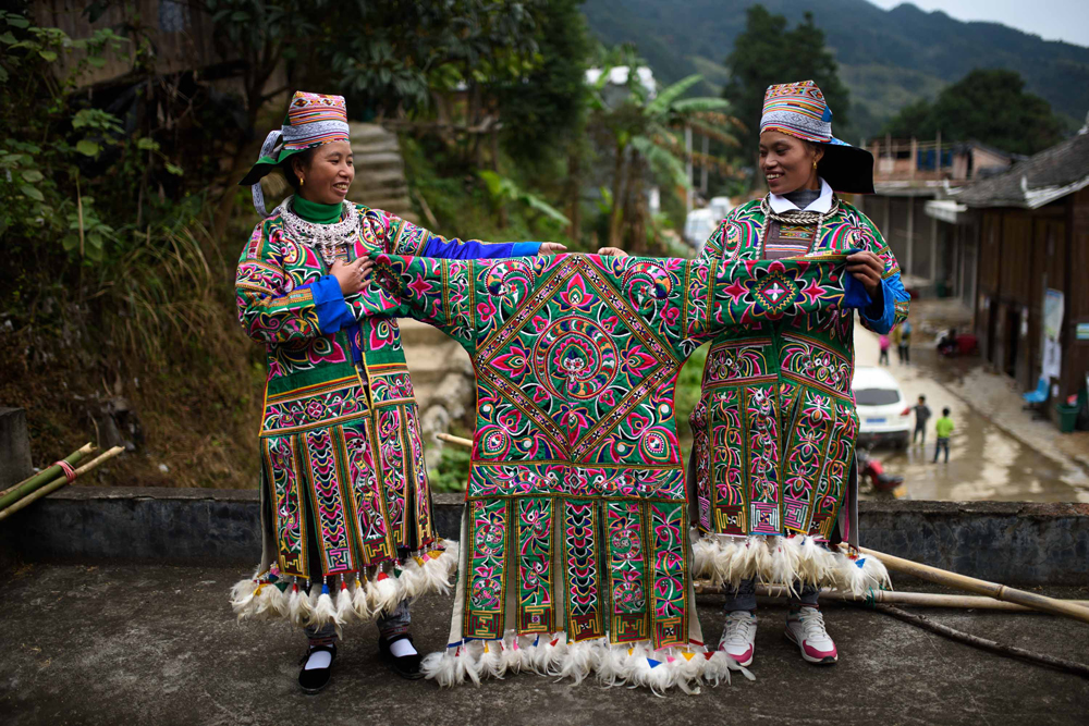 10月30日,贵州省黔东南州榕江县高排村的两名妇女在展示“百鸟衣”。