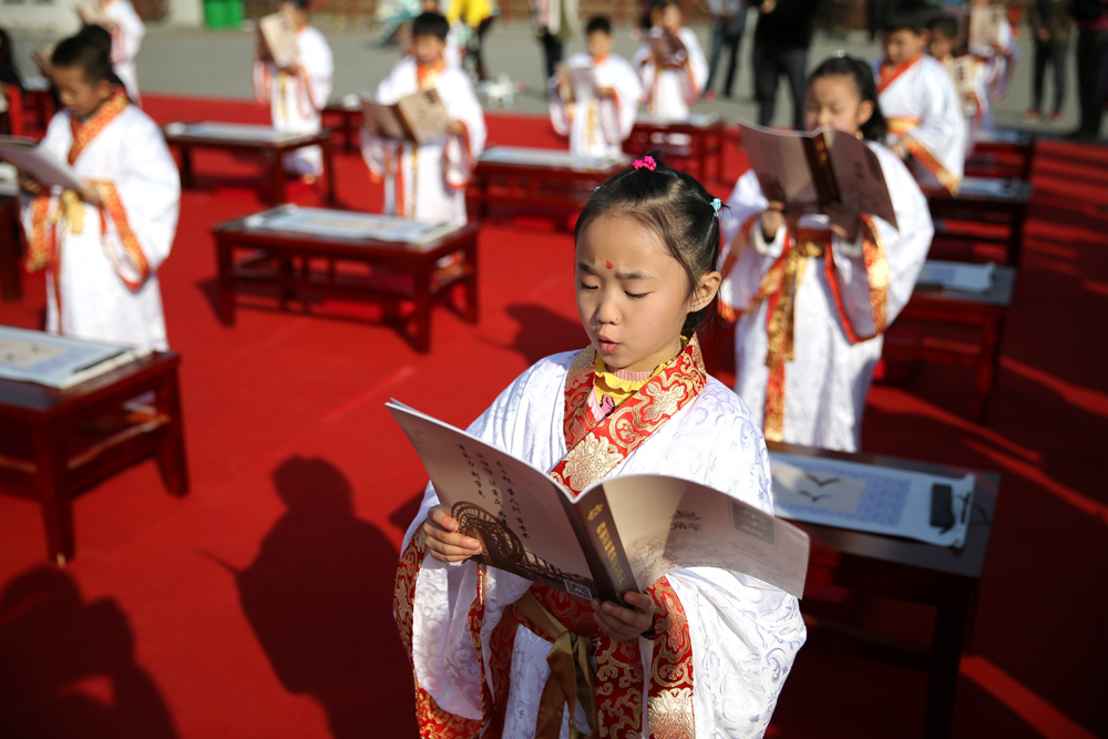 传统文化中儿童开始识字习礼的一种启蒙教育形式,共分奉茶礼、正衣冠、礼谢亲师等。 中新社
