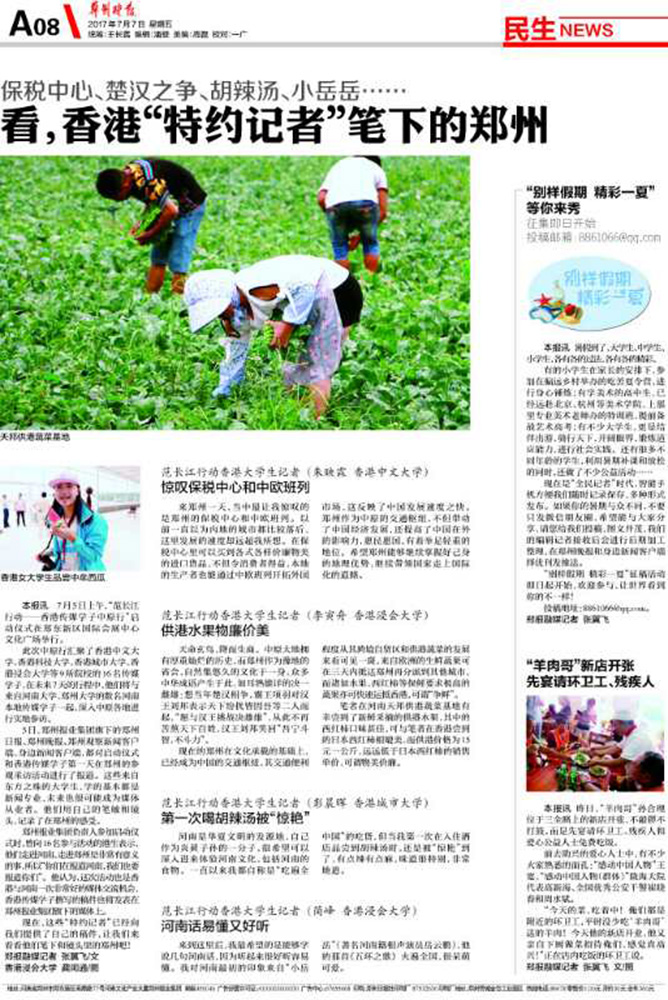 参加活动的16名香港学子“身兼数职”,不仅要作为大公报实习记者向香港读者报道河南,还获聘郑州报业集团特约记者,以大学生记者的身份向当地读者报道“港学子眼中的郑州”。学生们以文字、视频、文字等多种形式向郑州报业集团提供多角度的报道,把在郑州之行的所见、所闻、所思与更多的读者分享。