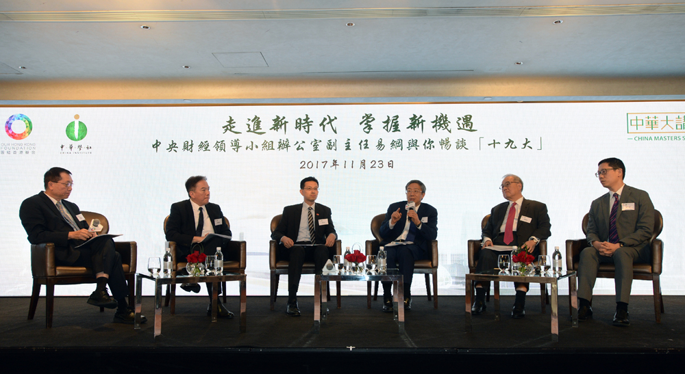 图:易纲及一众嘉宾畅谈十九大对香港带来的机遇。左起:雷鼎鸣、黄友嘉、吴秋北、易纲、郑慕智、黄杰龙