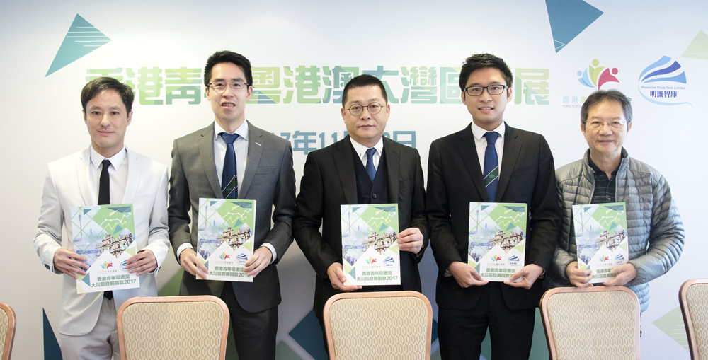 图:香港广东青年总会及明汇智库,就如何推动青年参与粤港澳大湾区发表研究报告。左二为郭基煇、中为明汇智库主席曾智明