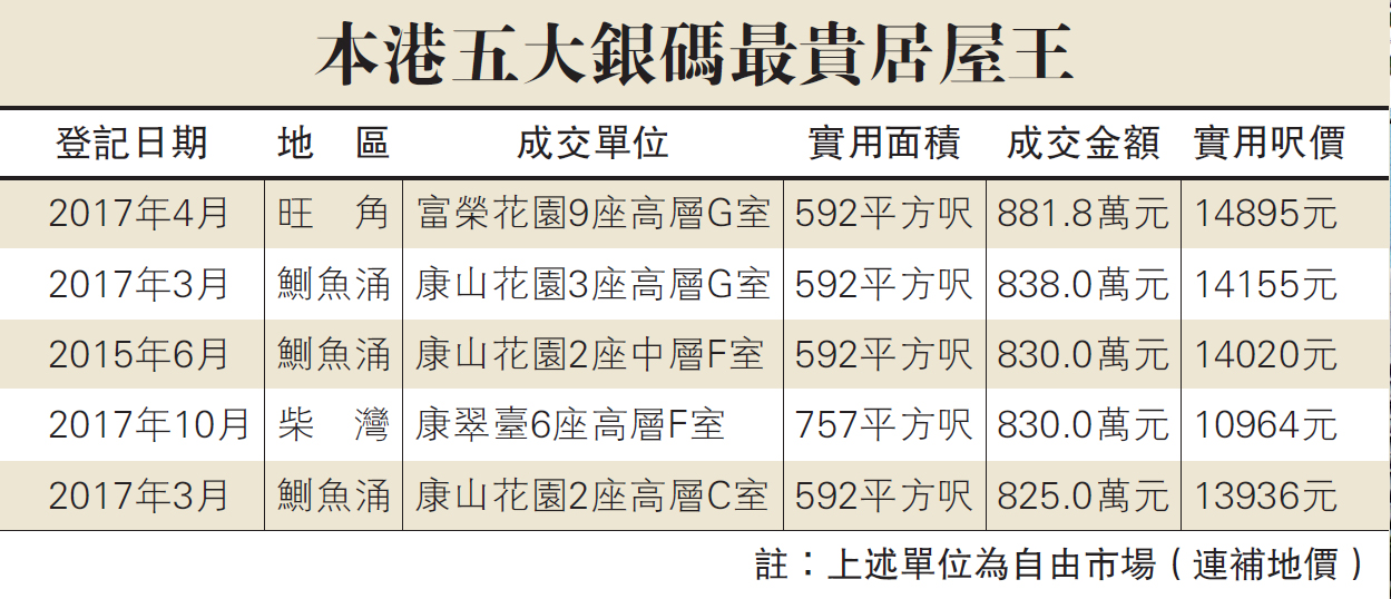 据土地註册处资料显示,柴湾康翠臺6座高层F室,实用面积757方呎,採三房间隔,上月以830万元连地价易手,实用呎价10964元,打破同区乐翠臺于2015年造出的790万元纪录,成为柴湾区银码最贵居屋王,与康山花园2座一伙592方呎的单位造价相同,双双跻身全港居屋第三位。据资料,原业主于2007年以238万元连地价买入,帐面赚592万元或约2.5倍。目前全港最贵居屋王是旺角富荣花园,售价达881.8万元,第二位为康山花园的838万元。同时,康翠臺现有一伙同面积单位放盘,绿表叫价达850万元,挑战全港绿表居屋纪录。