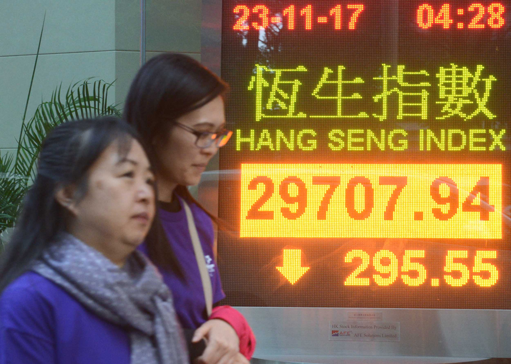 图:内地股市急挫拖累港股单日转向,收市下跌近300点,恒指失守30000点关口\中新社
