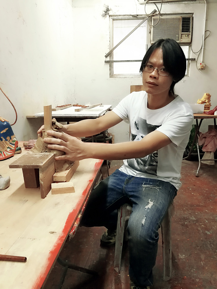 图:王彦发说,通常神像在製作完成后,会贴上金箔以示尊贵