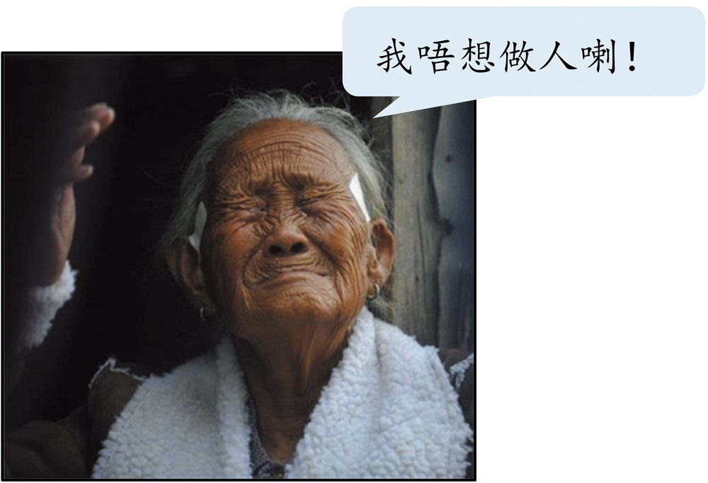 当“二叔婆”遇上不快事,如老公烂赌好嫖、儿子不务正业,“心抱/新抱1”刻薄对待,免不了呼天抢地、“要生要死”(叫生叫死)。为了营造及加强悲痛的效果,以博得各人的同情,从而迫使对方有所改善或稍作收敛,多会以手掌猛力拍打或拳头捶打胸膛,亦即广东人的“抌心/抌心口/抌心抌肺2”。