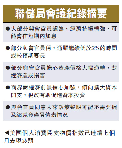 周三公布的会议纪录显示,与会官员除了关注通胀情况,同时观察经过一段长时间低息环境,可能引发的资产泡沫问题。数位与会官员表达对于潜在金融失衡的担忧,一旦资产价格大幅逆转将会打击经济。数位官员提到商界似乎更乐于投资,税改有助提升资本开支,少数与会官员则称税改前景有所改善。会议纪录同时显示,与会官员同意未来政策声明可能不会提及缩减资产负债表情况。