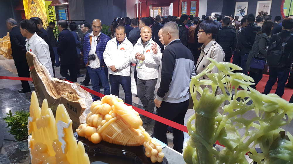 图:石艺创意精品吸引海内外客商的目光\ 大公报记者 方俊明摄