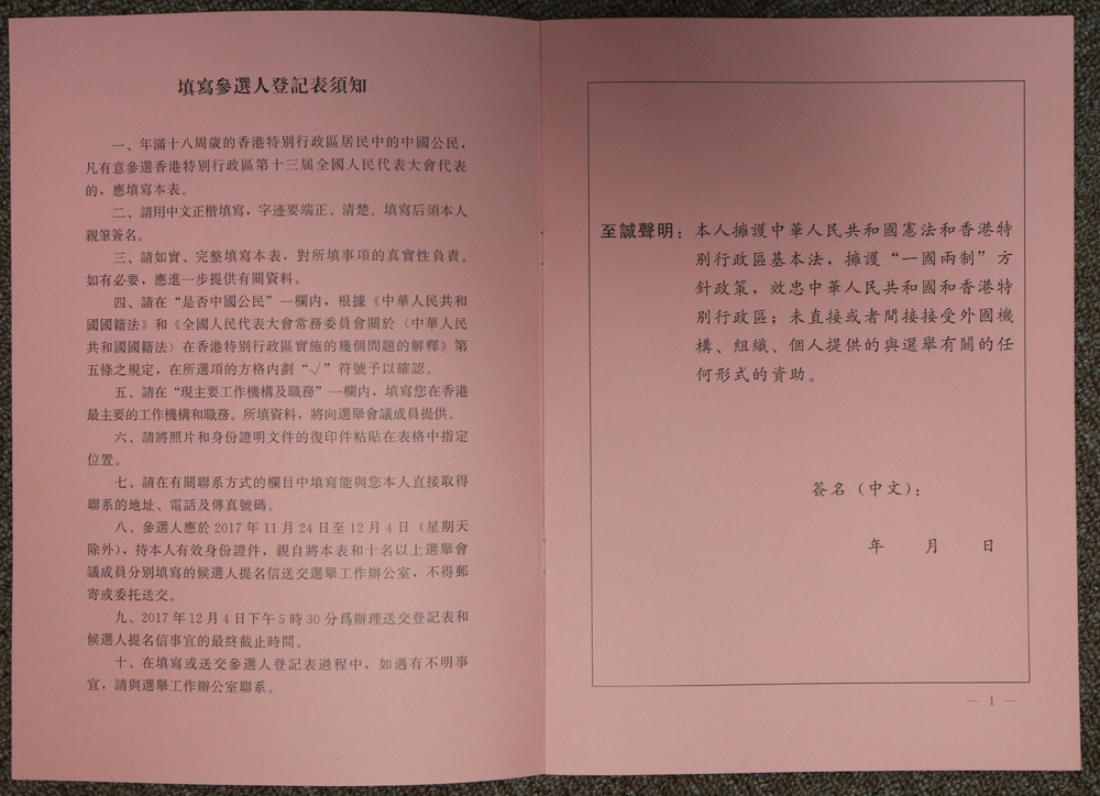 图:参选人应在登记表中声明拥护基本法和“一国两制”