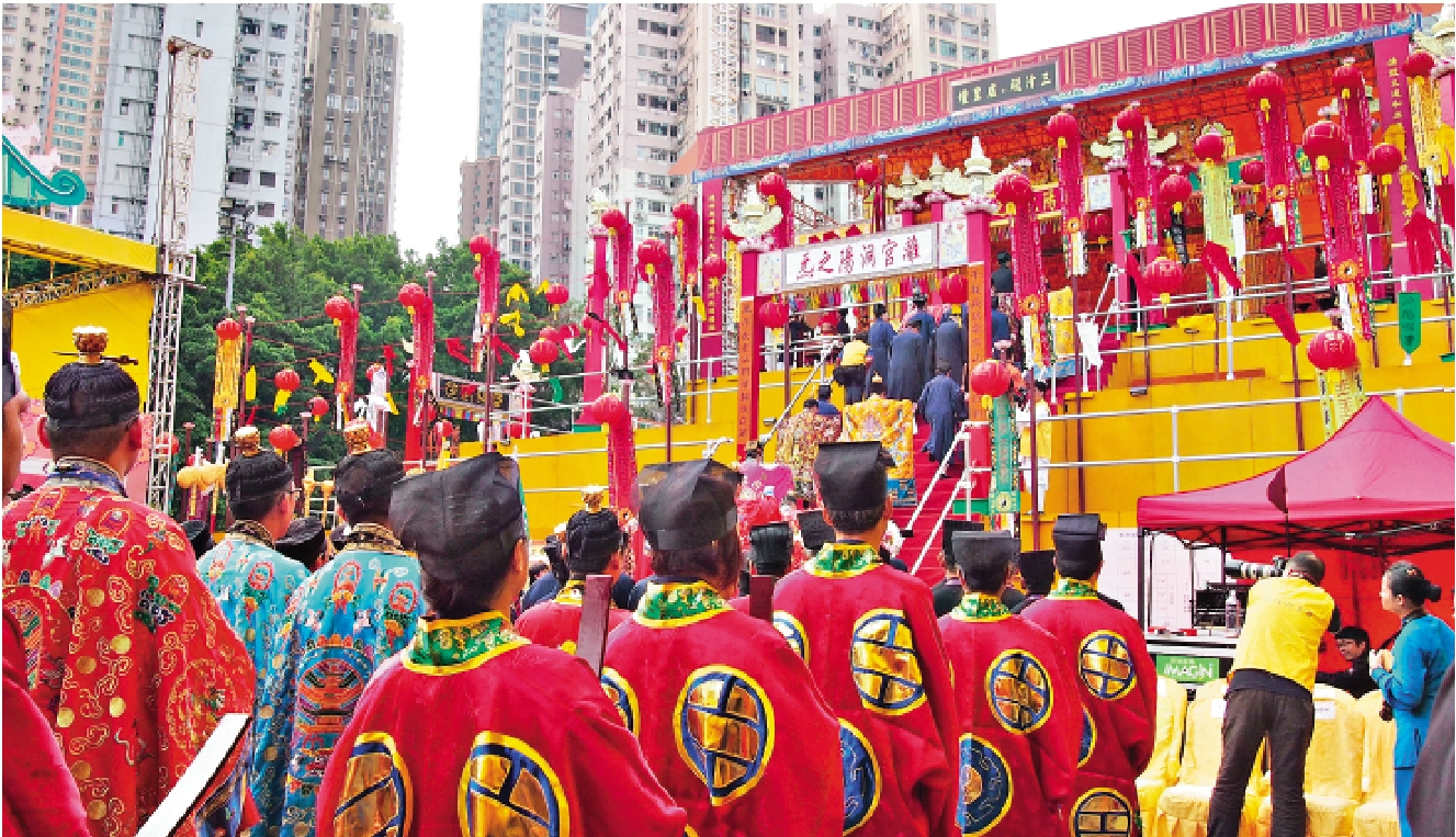 罗天大醮是道教一种高规格的醮仪,仪式将召请1200位天地各界神灵,旨在为整个国家祈求福祐,亦超度亡者。大醮由香港道教联合会主办,于坚尼地城海旁空地搭建了祭坛、九个殿堂和高达28呎的“三清殿.虚皇坛”。该坛是参照宋代经书《道藏》格局搭建,殿内外挂上明代记载的旗幡,供奉道教最高级的神明。
