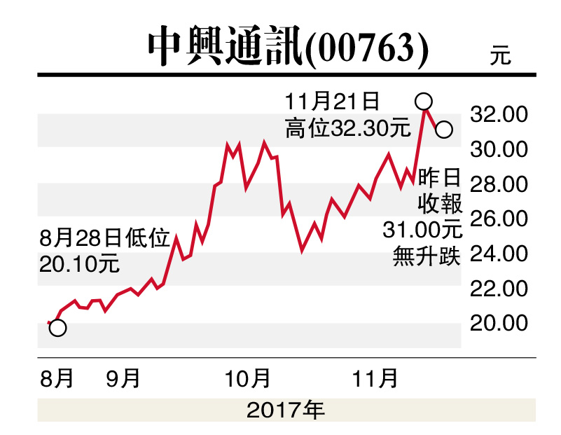 基本面方面,中兴首三季度净利润按年升36.6%至39.05亿元人民币;营业利润大增4.6倍,至52.87亿元。期内,收入增长7%,主要是由于运营商网络、消费者业务收入同比增长。综合毛利率为31.64%,同比基本持平。值得注意的是,集团去年因美国政府部门合计8.92亿美元罚款的一次性影响,而产生亏损,但今年无重大营业外支出,相信今年全年业绩将扭亏为盈,公司估计可录得净利润43至48亿元。