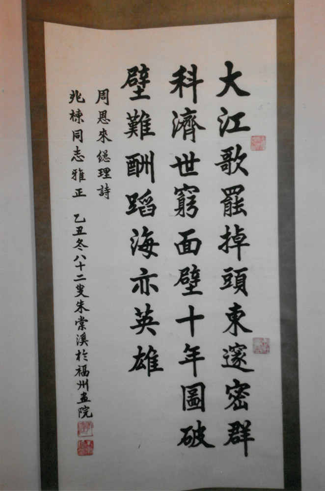 图中为朱老先生一九八二年(乙丑冬)题赠笔者周恩来总理早年(一九一七年)东渡日本前写的一首七绝诗句。他还另题一幅周恩来语“险夷不变应尝胆,道义争担敢息肩”的对联赠送笔者。